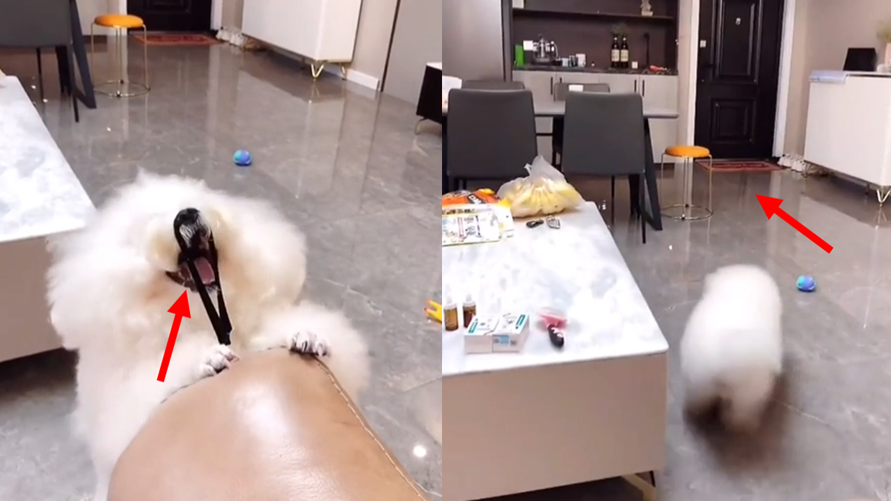 뜨거운 호응을 받는 영상 속에 주인공 댕댕이는 늘어나는 작은 끈을 집안에 있는 가구와 앞발 그리고 입을 이용해서 고정하고 늘리고 날려리고 다시 가지고 와서 반복하는 놀이를 하면서 스스로 즐거운 시간을 보내고 있습니다.