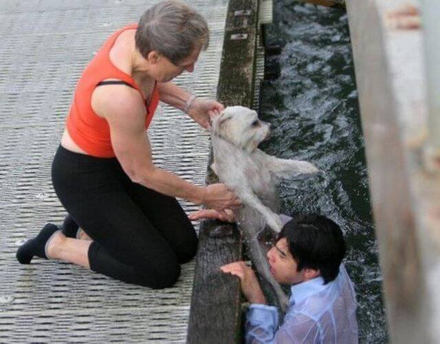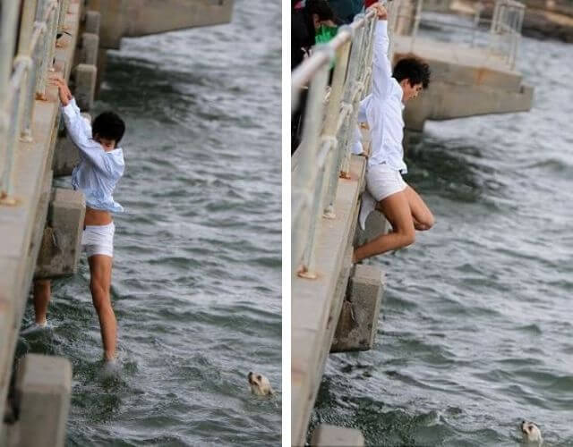 그는 그 장면을 본 순간 부두가로 달려가서 천천히 바다를 향해 들어가기 시작하였습니다. 작은 강아지는 살기위해서 바다에서 노력을 하였으며, 그는 강아지를 구조하는데 성공을 하였습니다. 하지만, 해안가로 가기에는 너무나 먼 거리였고, 자신이 내려온 부두가 위로 올라가기 위해서 노력하였습니다.