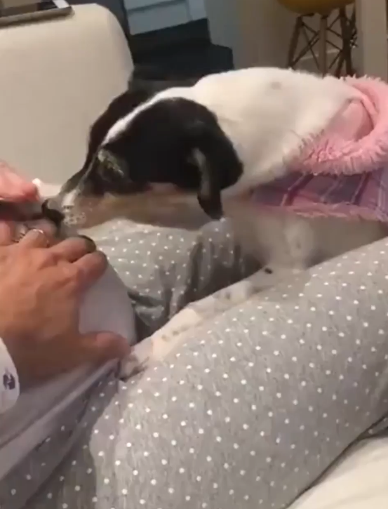 이 영상 속에서 강아지는 오랜 기간 자신을 돌봐주는 엄마의 임신을 오랜 기간 동안 인지하고 있습니다. 그리곤 뱃 속에 있는 아이와 소통을 하고 싶어서 인지 배를 감싸고 있는 엄마의 손을 내리게 한 후에 자신의 귀를 배에 살포시 기대고 있습니다.