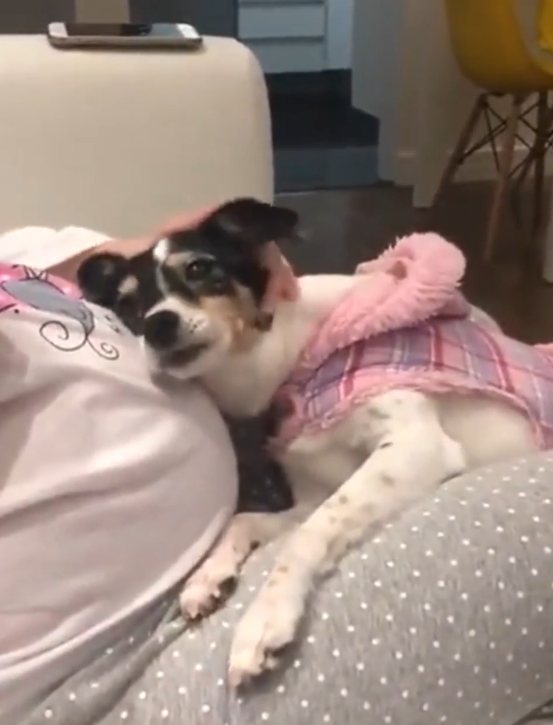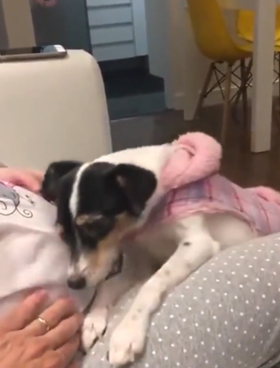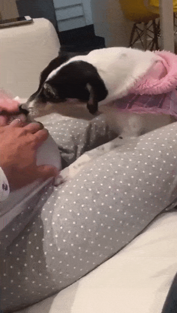 이 영상 속에서 강아지는 오랜 기간 자신을 돌봐주는 엄마의 임신을 오랜 기간 동안 인지하고 있습니다. 그리곤 뱃 속에 있는 아이와 소통을 하고 싶어서 인지 배를 감싸고 있는 엄마의 손을 내리게 한 후에 자신의 귀를 배에 살포시 기대고 있습니다.
