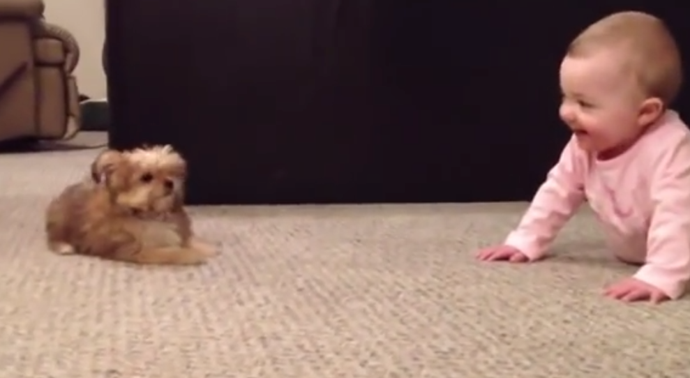 이제 막 기어 다니기 시작한 작은 아이가 있습니다. 그리고 반대편에는 작고 귀여운 강아지가 아이를 보고 있습니다. 어른들은 알아들을 수 없는 자신들의 언어로 서로는 대화를 시작합니다.