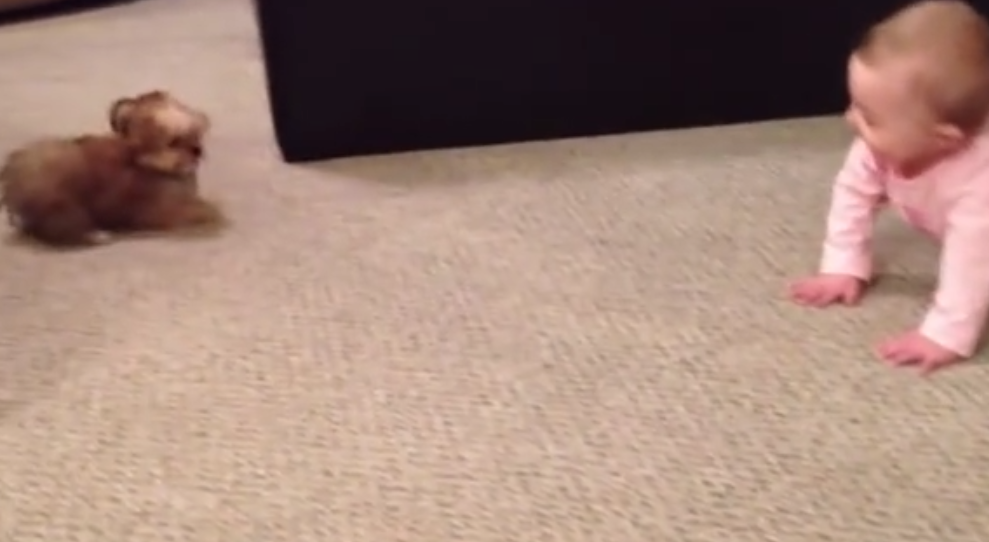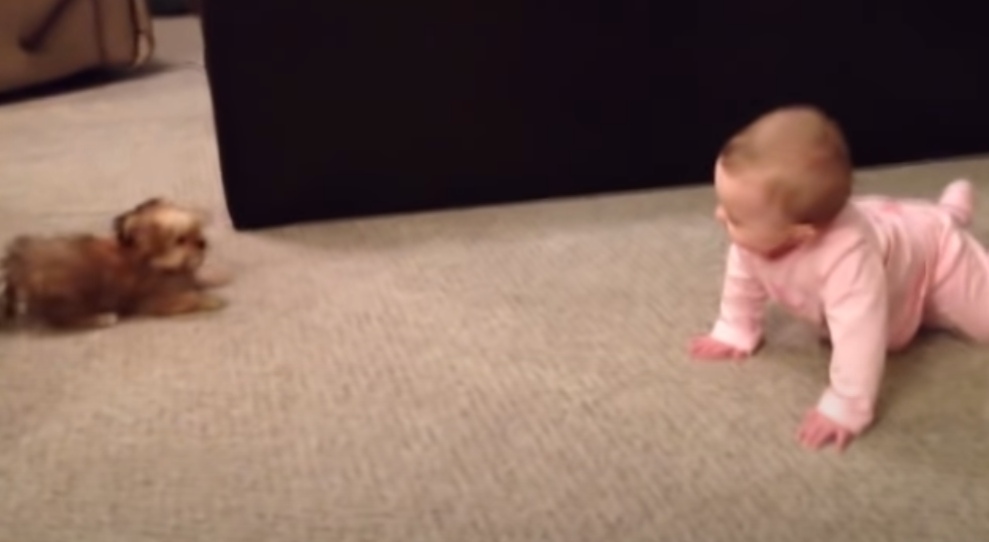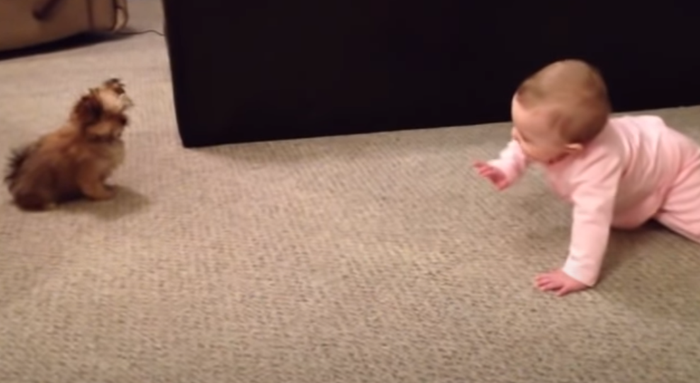 이제 막 기어 다니기 시작한 작은 아이가 있습니다. 그리고 반대편에는 작고 귀여운 강아지가 아이를 보고 있습니다. 어른들은 알아들을 수 없는 자신들의 언어로 서로는 대화를 시작합니다.