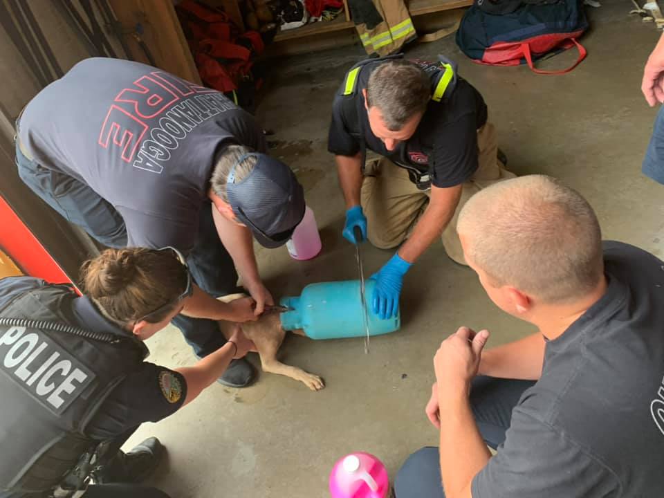 지난 7일 미국의 한 소방서에는 특이한 모습으로 찾아온 강아지가 있습니다. 마을에서 신고를 받은 경찰관이 강아지를 구조하기 위해서 강아지를 데리고 소방서로 찾아온 것으로 강아지의 머리에는 무언가 달려 있었습니다.