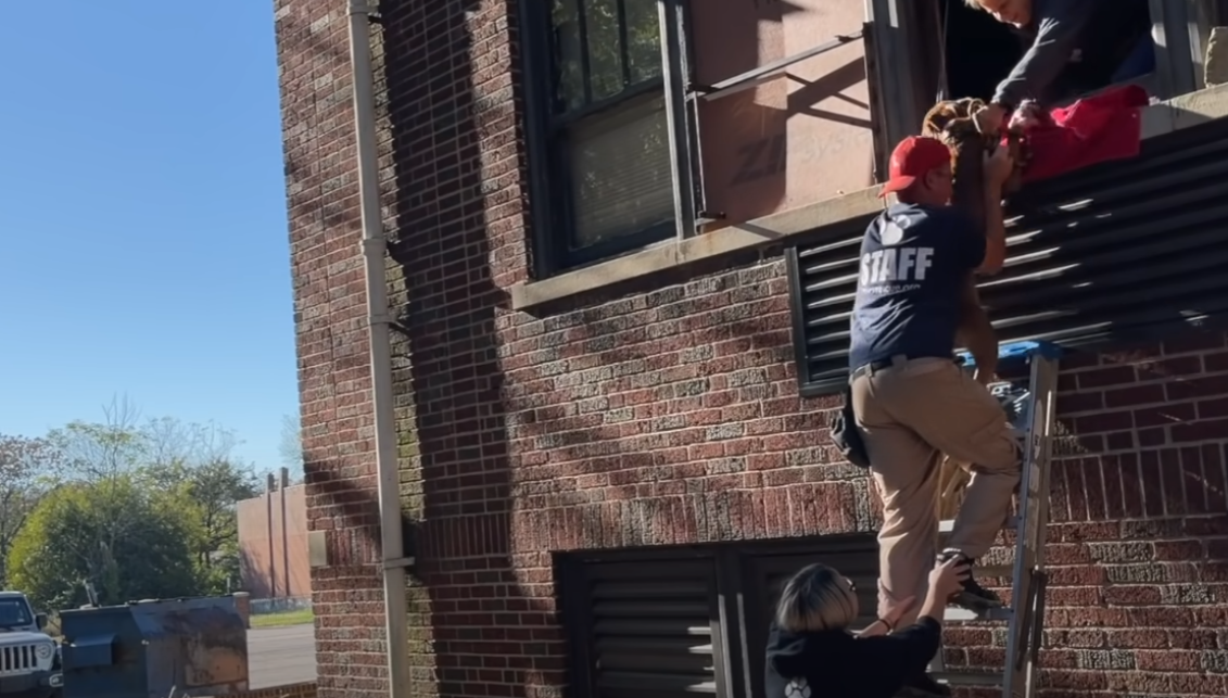겁에 질려있던 개는 2층 창가에서 사람들을 계속 내려다보고 있었습니다. 학교 문을 열 수 있는 방법이 없었기 때문에 구조대원들은 사다리를 이용하기로 하였습니다. 그리고 올라갈 수 있는 위치를 찾았으며 그곳은 지면과 2층과의 높이 차이는 약 6미터 정도의 높이로 구조대가 사다리로 올라갈 수 있는 높이였습니다.