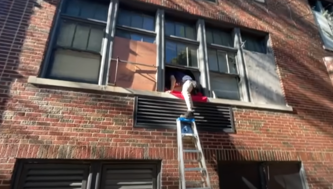 겁에 질려있던 개는 2층 창가에서 사람들을 계속 내려다보고 있었습니다. 학교 문을 열 수 있는 방법이 없었기 때문에 구조대원들은 사다리를 이용하기로 하였습니다. 그리고 올라갈 수 있는 위치를 찾았으며 그곳은 지면과 2층과의 높이 차이는 약 6미터 정도의 높이로 구조대가 사다리로 올라갈 수 있는 높이였습니다.