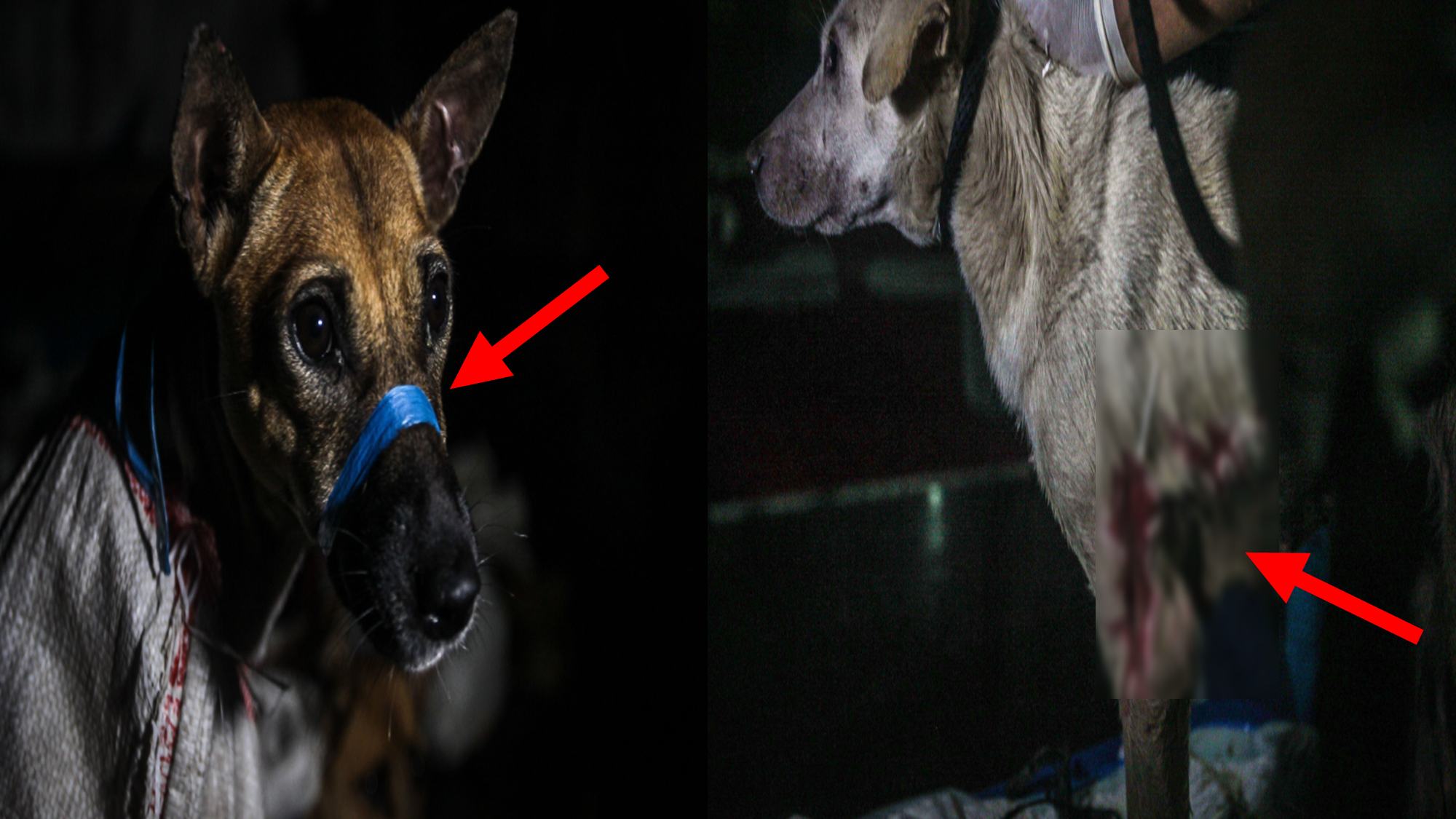 끈으로 입이 묶인 채 자루 안에 담겨져 이동하던 50마리 중에 안타깝게도 한 마리는 살아남지 못했습니다. 그러나 나머지 개들도 학대 속에서 몸이 쇠약해지고 죽어가는 상태였습니다.