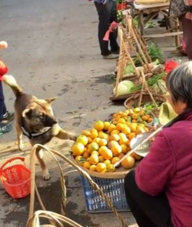 곧이어 이 강아지는 오렌지를 구매하기 위해 가게 앞에