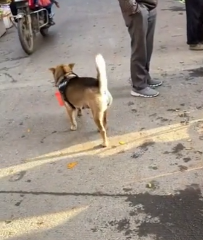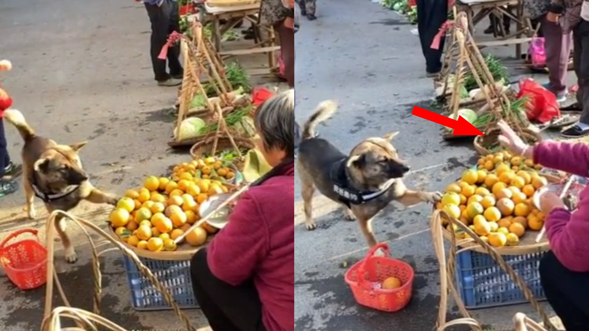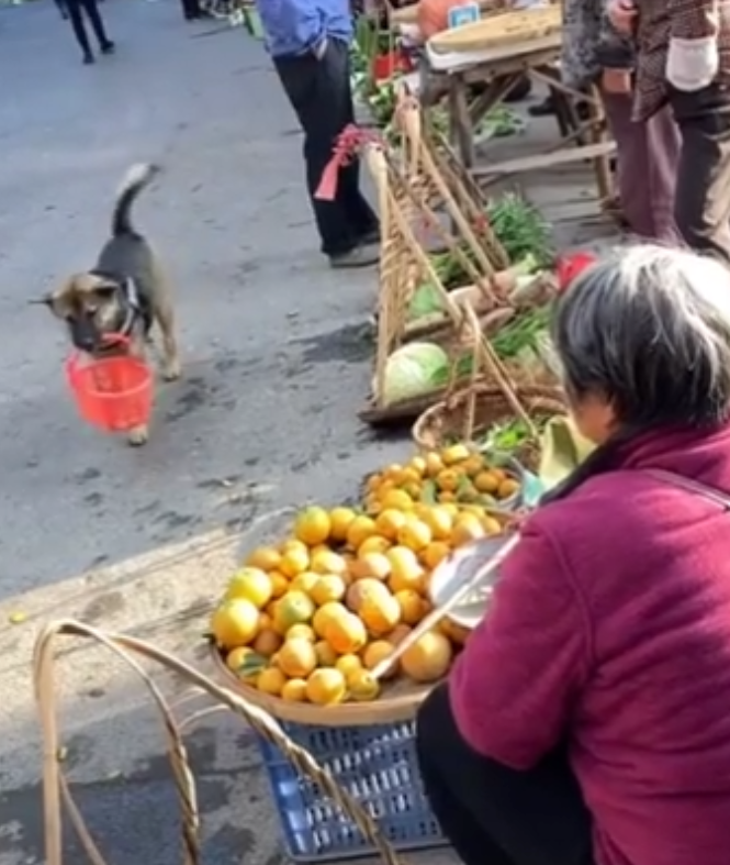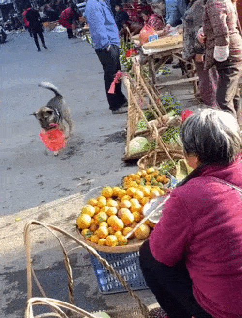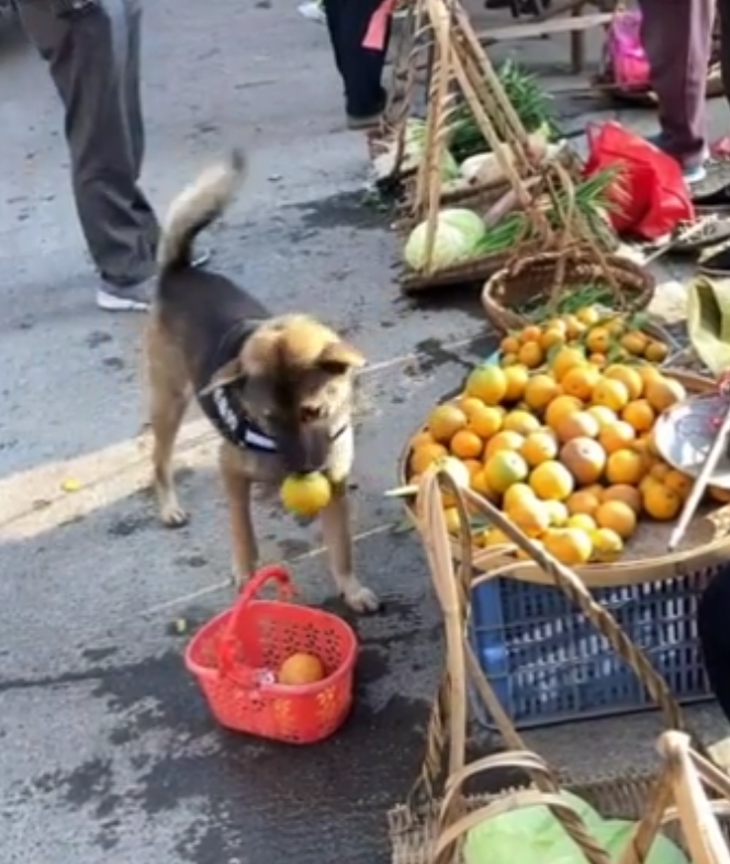 영상에서 강아지는 시장 한복판에 자연스럽게 바구니를 입에 물고