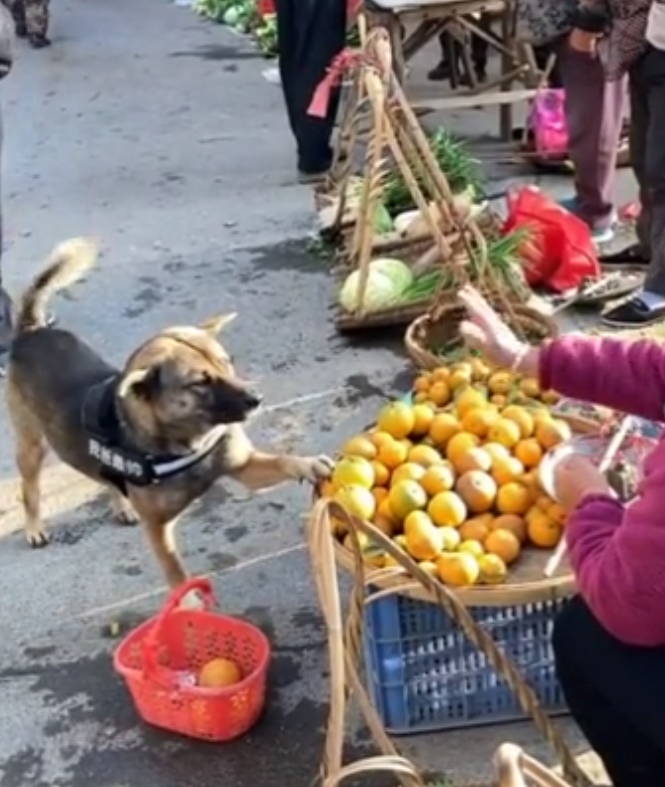 곧이어 이 강아지는 오렌지를 구매하기 위해 가게 앞에