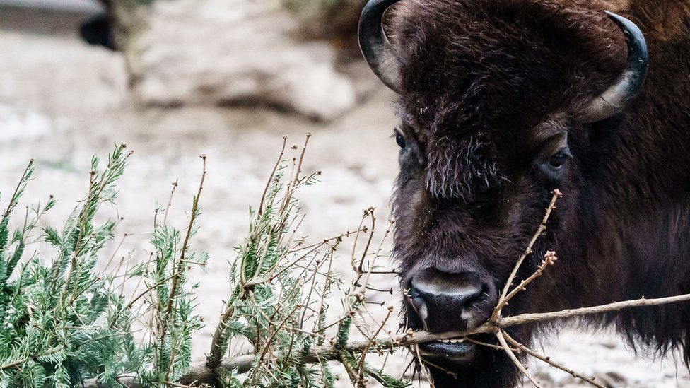 동물들은 각자의 방식으로 크리스마스 트리를 가지고 크리스마스를 보냈는데요, 들소는 나무를 갉아먹습니다. 그들에게 나무 먹이는 흔하지 않기도 하며 에센셜 오일을 섭취할 수 있다고 합니다.