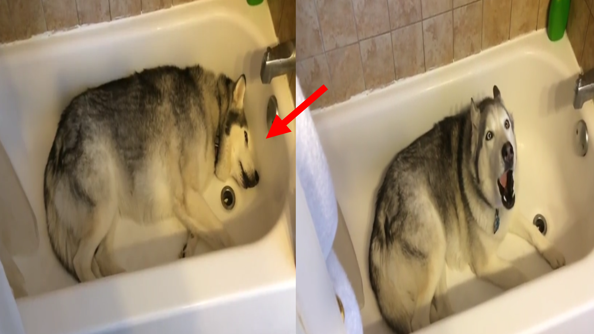 영상 속 주인공 제우스는 당시 7살의 듬직한 허스키로 욕조에서 물놀이를 하는 것을 상당히 좋아하는 강아지입니다. 한참 산책을 해야 하는 시간에도 밖을 나가려고 하지 않고 욕조 속에 온 몸을 넣은 후에 말을 듣지 않고 울부짖으면서 물을 받아달라고 항의를 하고 있습니다.