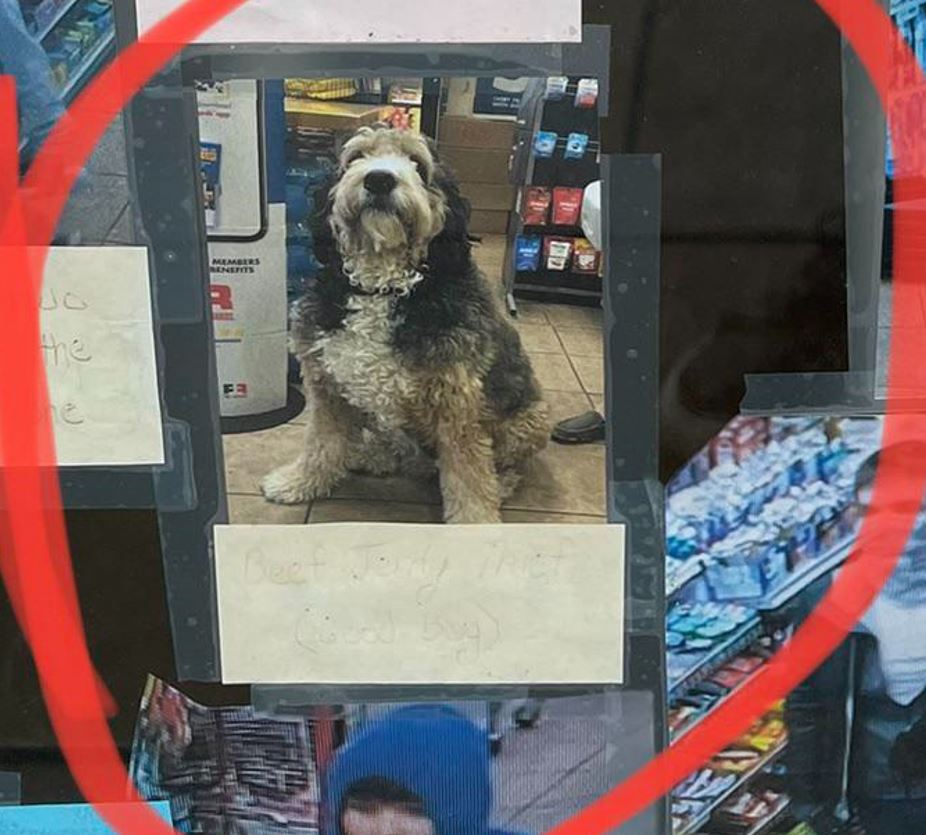 자세히 사진 속 강아지의 절도 내역을 확인해보면 소고기 육포 절도 라고 써있는 것을 확인할 수가 있습니다. 지나가는 시민들도 이 사진을 보면 그냥 지나칠 수가 없을 것입니다.