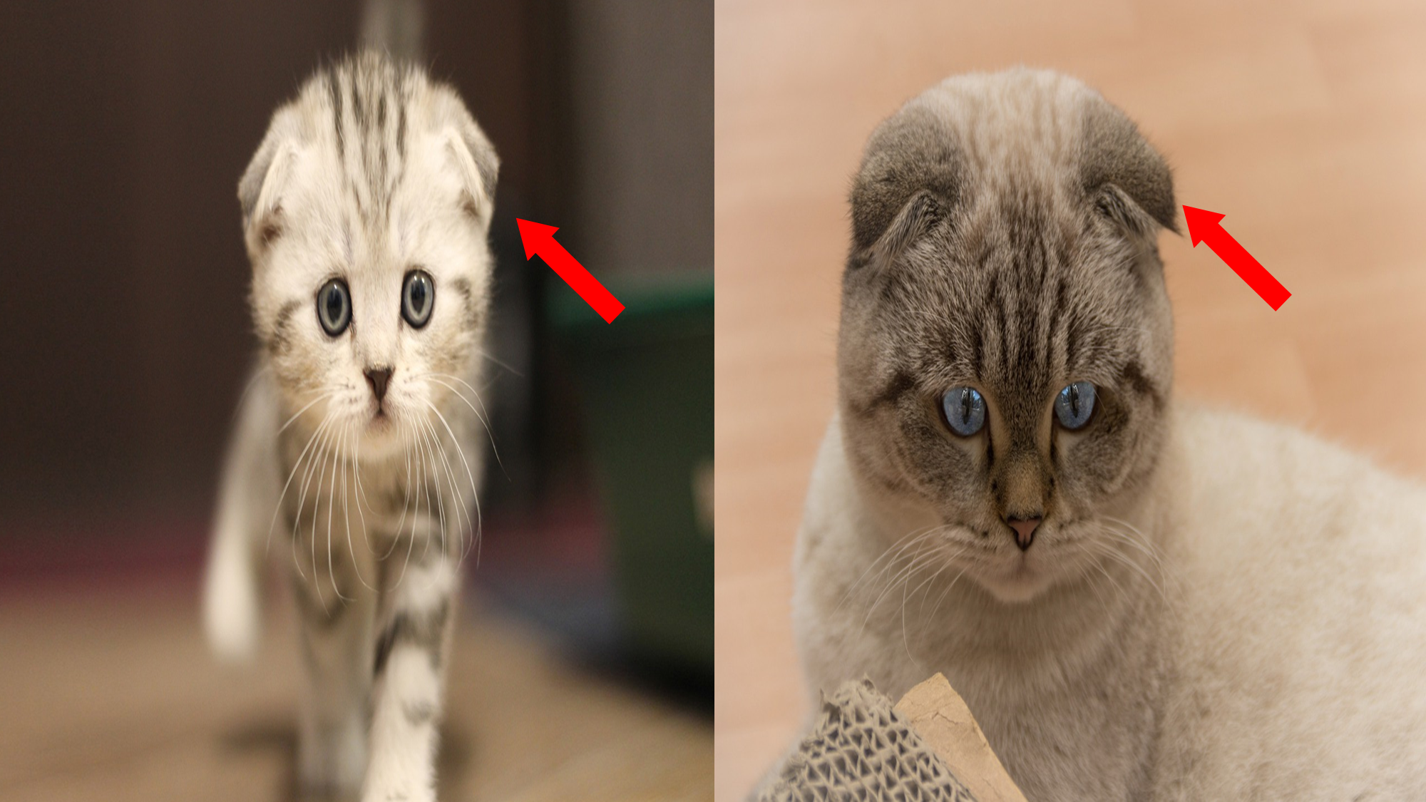골 연골 이형성증'은 연골 발달에 이상이 생겨 관절마다 문제가 생기고 연골이 약해 귀가 제대로 서지 못하고 쳐지며 걸을 때도 다리 관절에 통증을 느끼거나 꼬리의 움직임도 둔합니다. 또한 뜀박질에도 어려움을 느끼며 고양이의 트레이드 마크인 '식빵 굽기'도 어려워한다고 합니다.