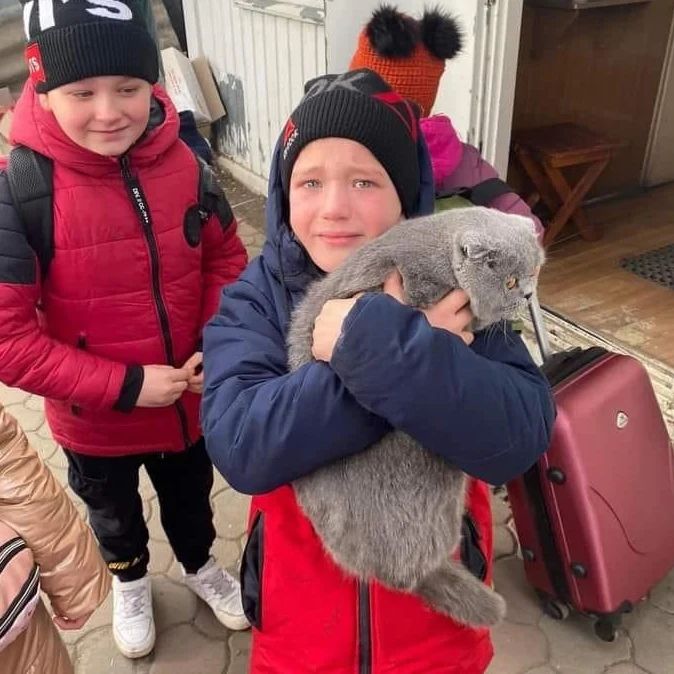 어린 소년은 고양이를 끌어안고 있습니다. 전쟁의 위험은 피했지만, 피난을 가는 긴 여정 동안 그의 눈엔 여러번의 슬픔과 눈물이 가득했을 것입니다.
