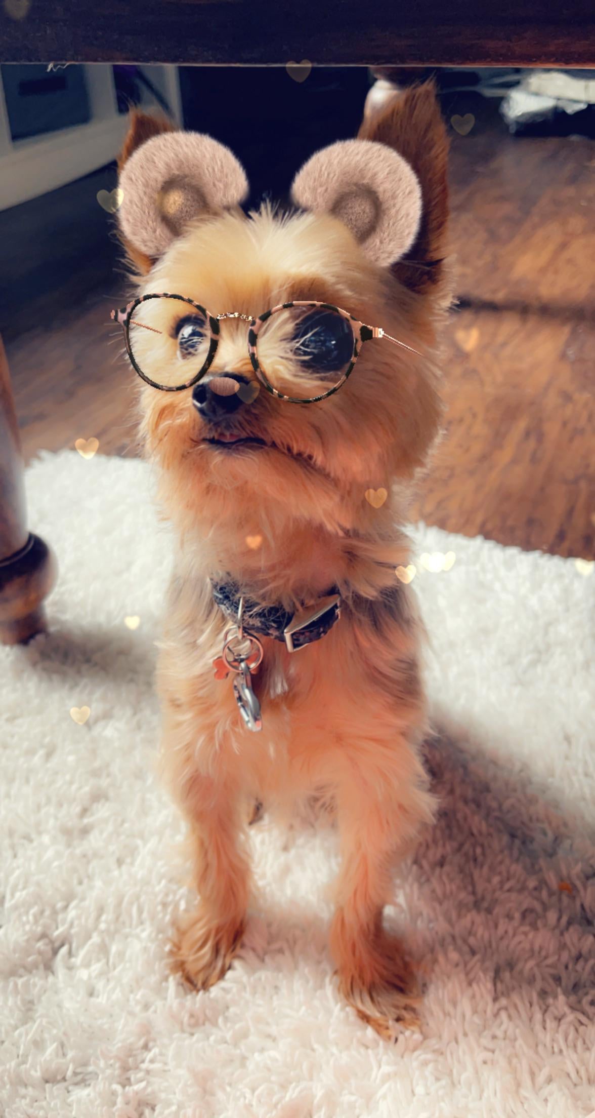 마치 애니메이션에 등장하는 너무나 익숙한 강아지의 모습을 하고 있습니다. 하얀 뿔테에 선그라스 그리고 이마에 하트까지 자세와 함께 잘 어울리는 인생사진이 나왔습니다.