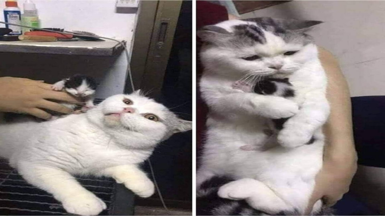 품에다가 안겨 줍니다. 처음 새끼를 본 고양이는