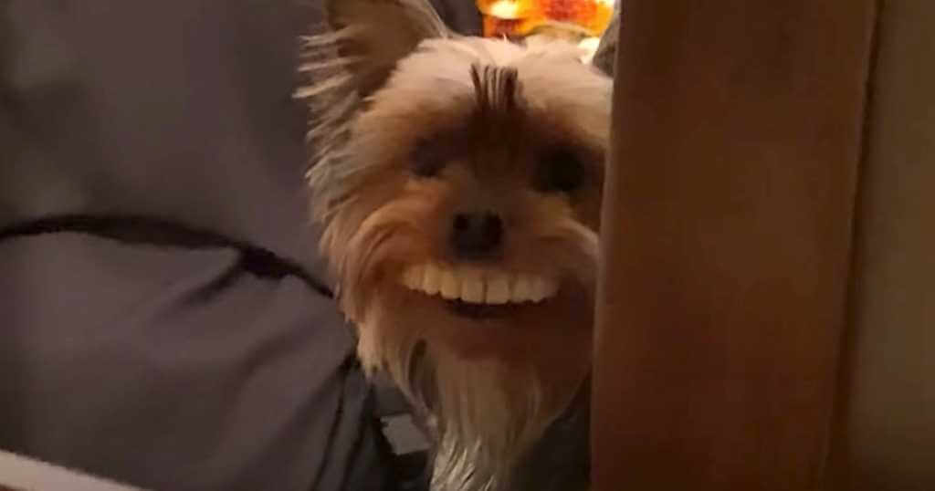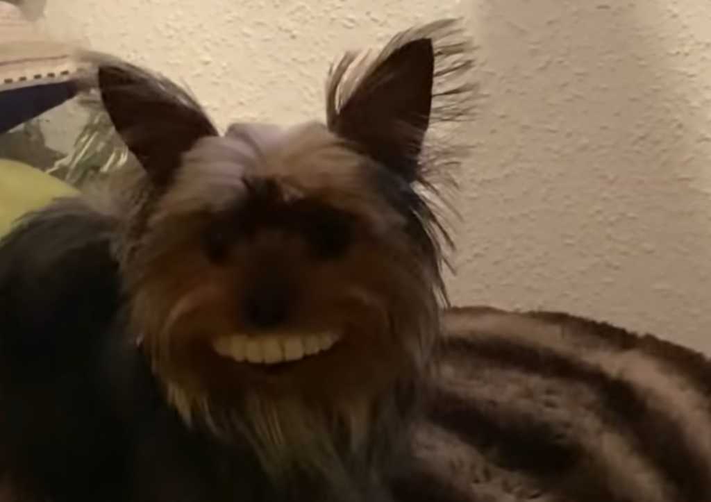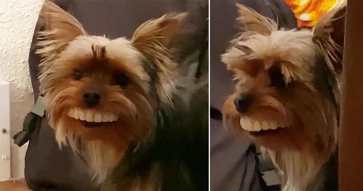 가짜 이빨을 착용한 작은 강아지의 표정을 보는