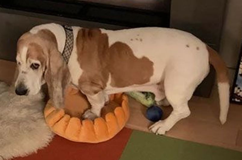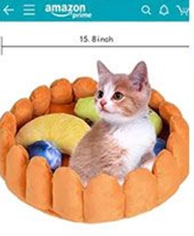 주황색 울타리 모양의 침대는 아마존에서 고양이 전용으로 판매하는 제품으로 원래 주인이 편안하게 쉬고 있던 사진도 확인이 가능합니다. 사진 속 고양이는 멀리서 자신의 침대만 구경을 할 뿐 강아지가 하루종일 가지고 있는 것을 볼 수가 있습니다.