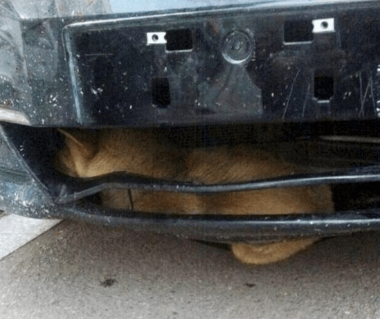 자신의 차 앞 범퍼 사이에 개가 들어가