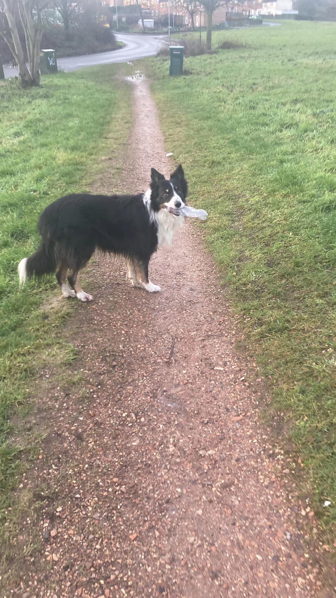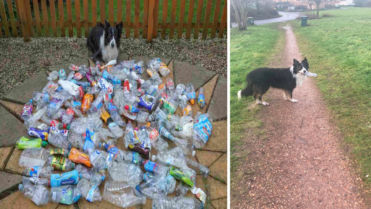 환경 보호를 위해서 산책하는 동안 거리에 있는 이것들을 모두 수거하는 강아지