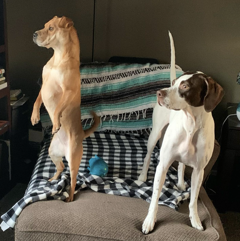 한 명은 미어캣처럼 두발을 들고 서 있습니다.