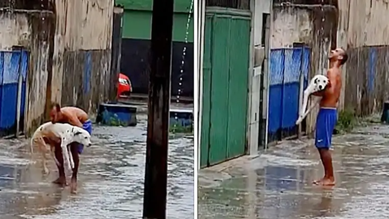 같이 비 속에서 놀다가 땅에 쓰러지는