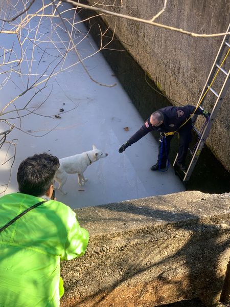 소방관은 개를 구하기 위해 몸에 로프를