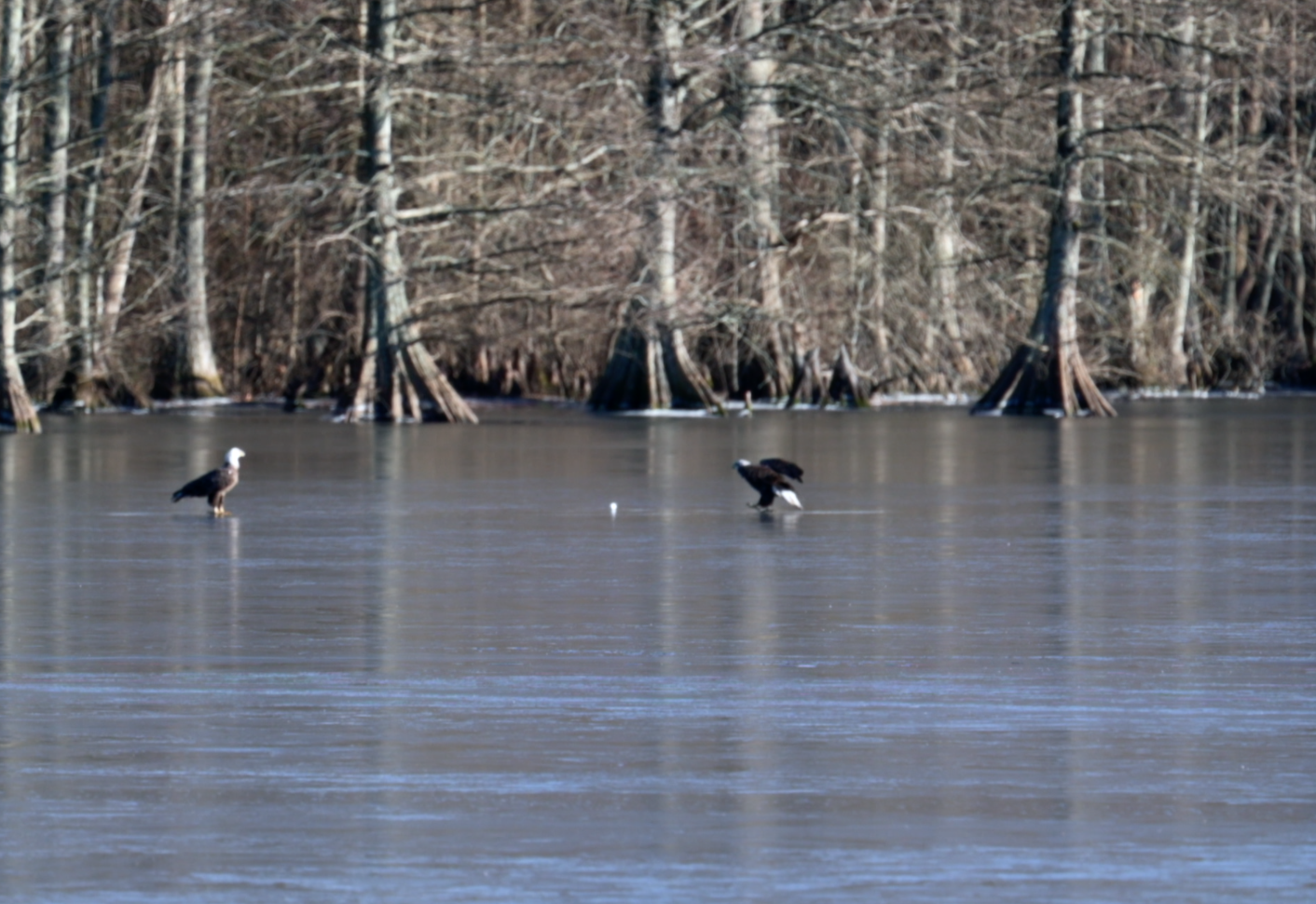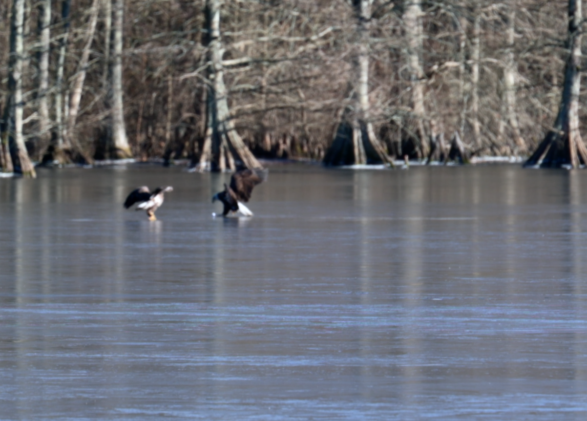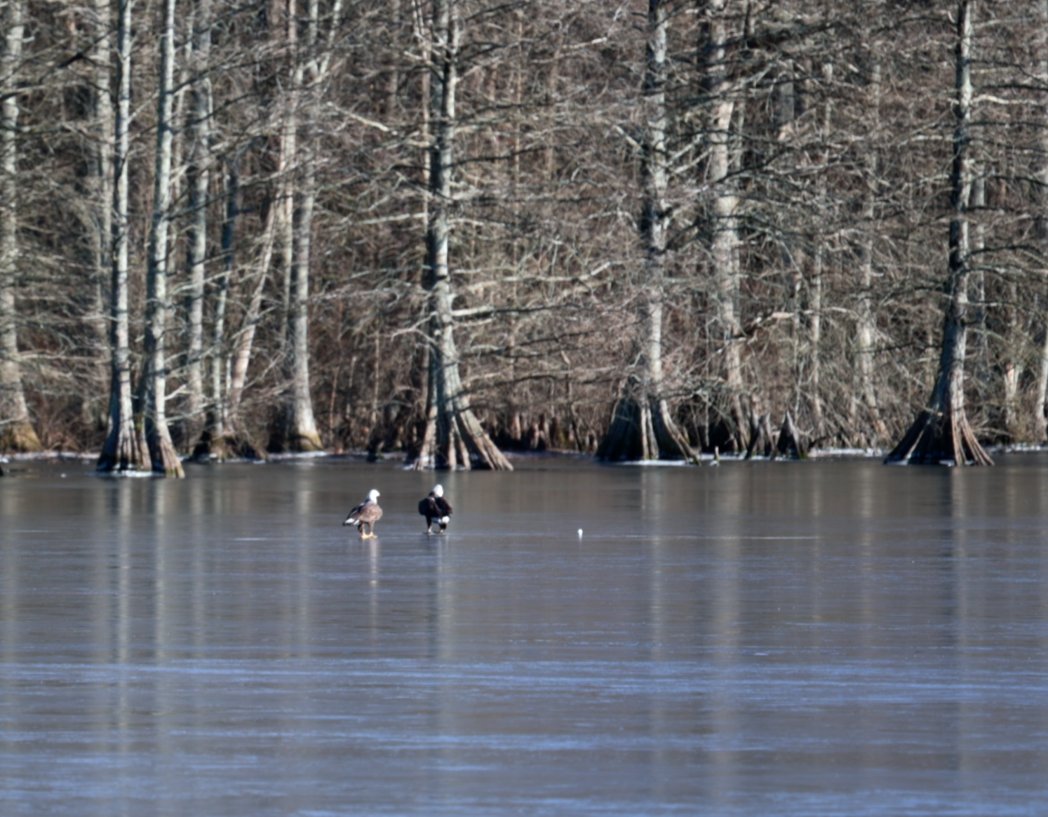 독수리가 꽁꽁 얼어 있는 호수 중간에서