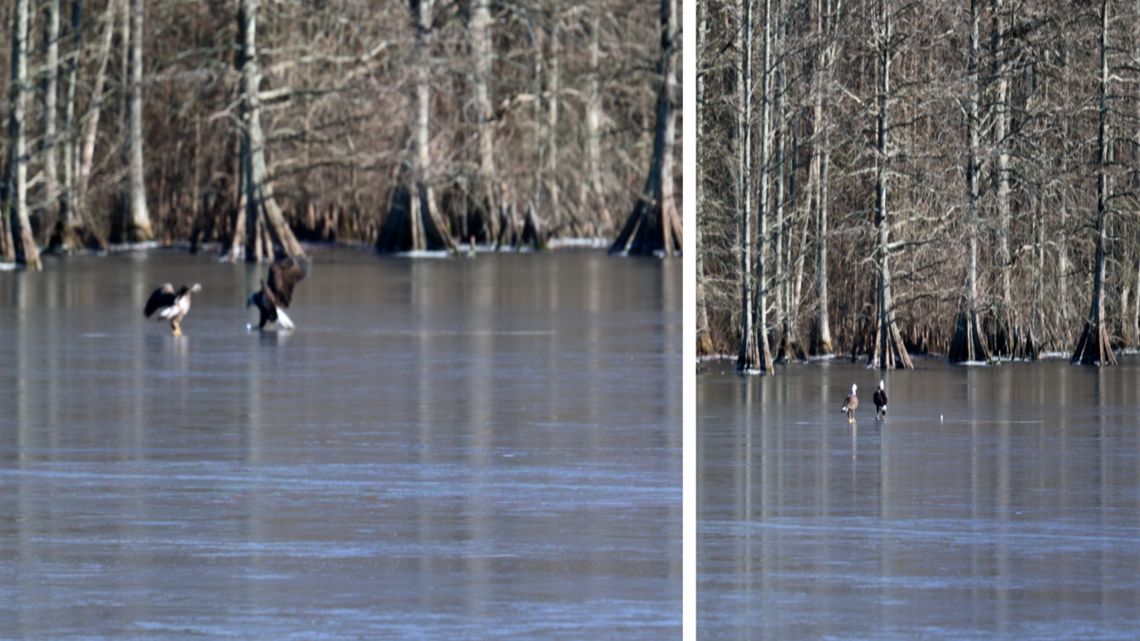 독수리가 꽁꽁 얼어 있는 호수 중간에서