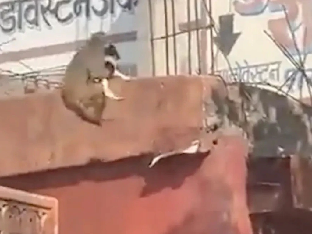원숭이가 개를 낚아채 옥상에서 뛰어