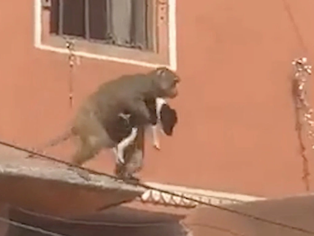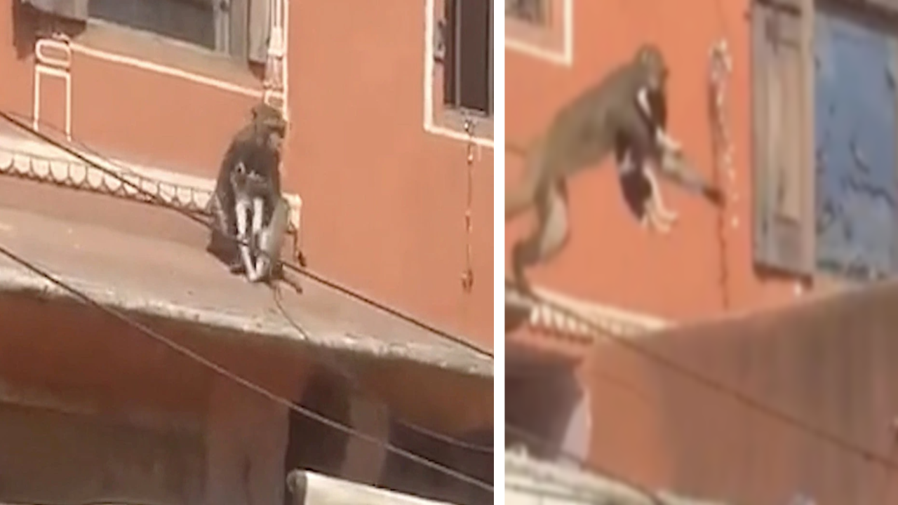 원숭이가 개를 낚아채 옥상에서 뛰어