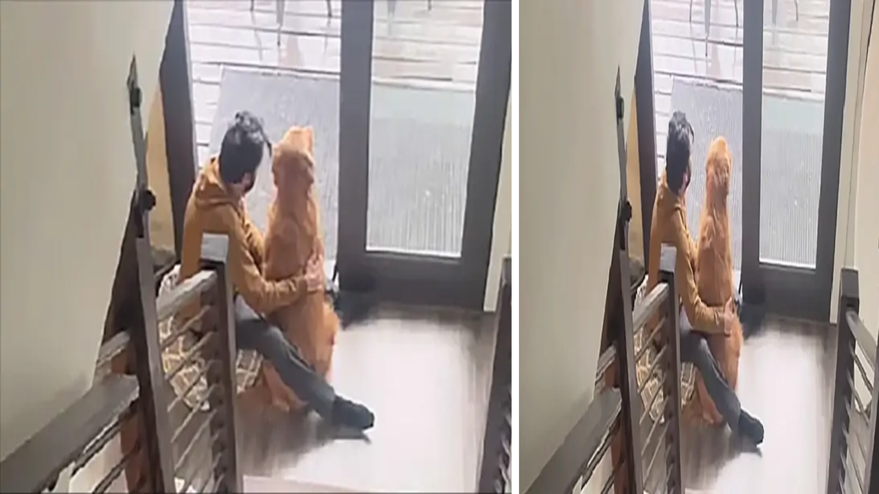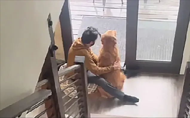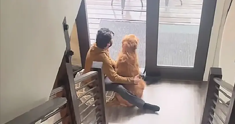 골드레트리버가 서로를 감싸고 문 앞에