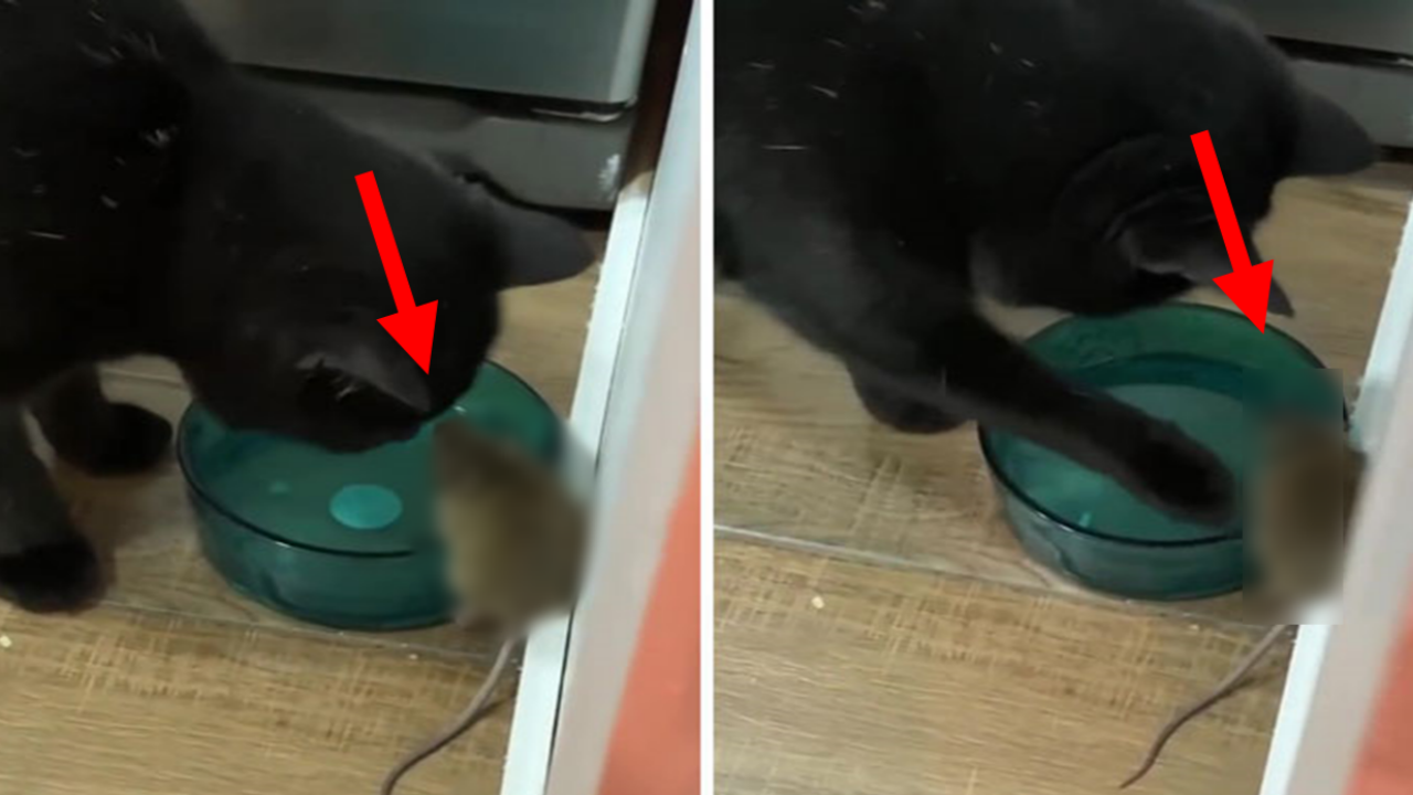 하지만 예상과는 다르게 고양이 시몬은 집에 들어온 쥐와 함께 물을 마시기 시작하였습니다. 그리곤 편안하게 마시게 두었고 그런 모습이 귀여웠는지 전혀 위협적이 않은 앞 발을 이용해서 쥐의 머리를 계속 쓰담쓰담해줬습니다.