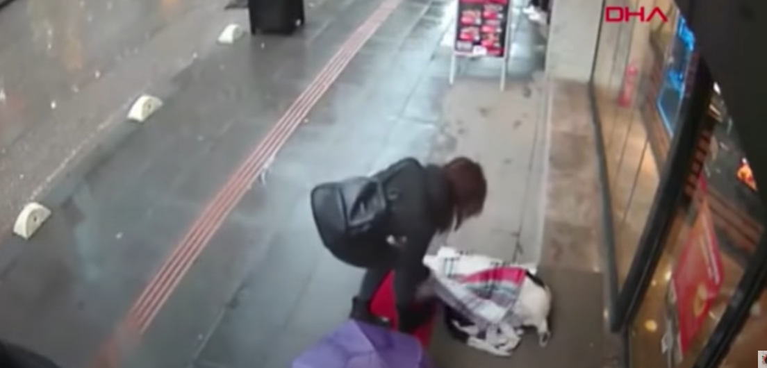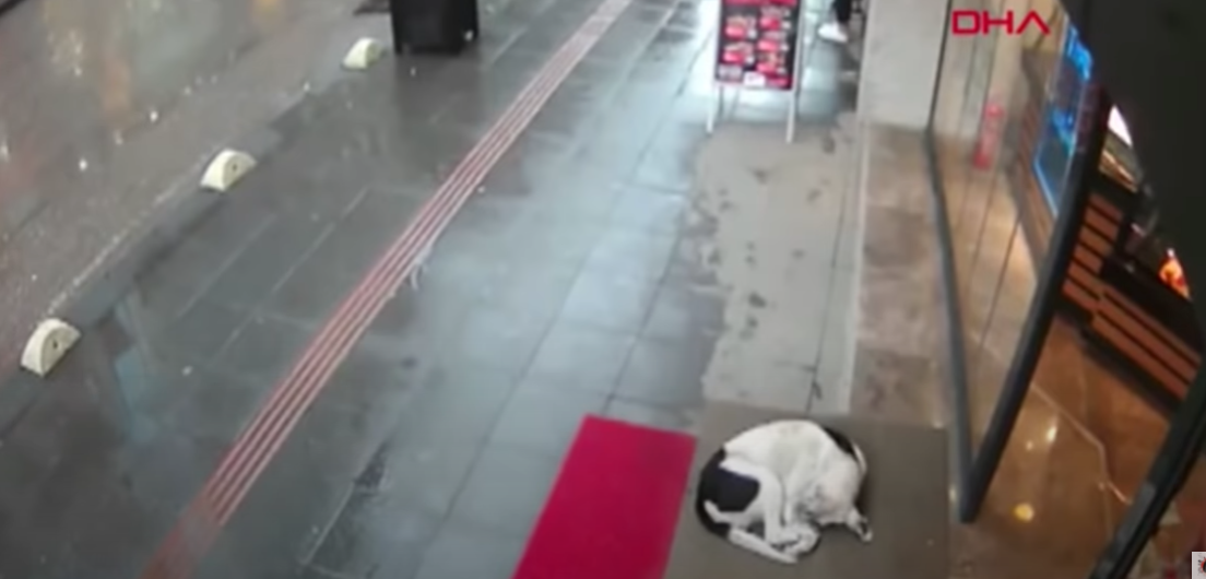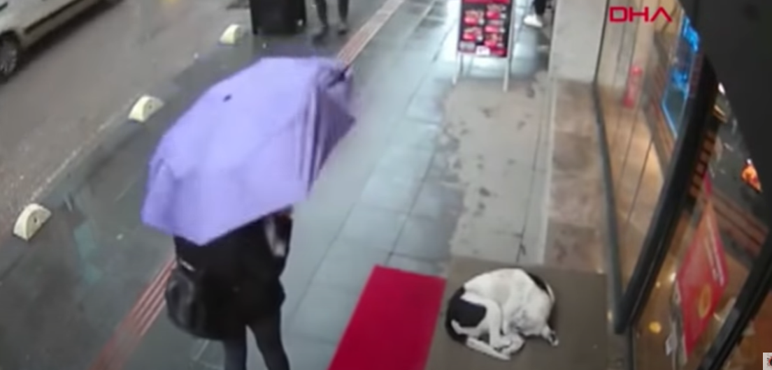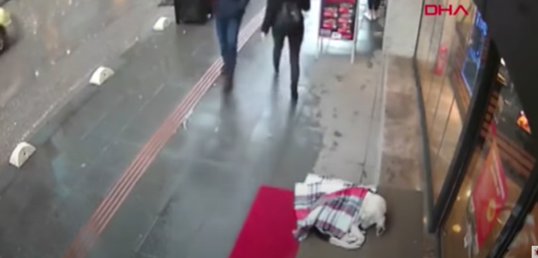 카페에서 나온 손님은 바닥에 웅크린체 떨고 있는 강아지를 발견을 하였습니다. 모두가 무심하게 지나갔지만 이 손님은 그 자리에 서서 몇 초동안 생각에 잠겨 있었습니다. 그리고 그 손님은 자신이 가지고 있던 스카프를 웅크리고 있는 강아지에게 덮어주었고 그 자리를 떠났습니다.