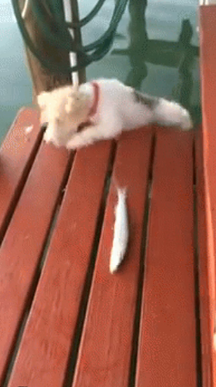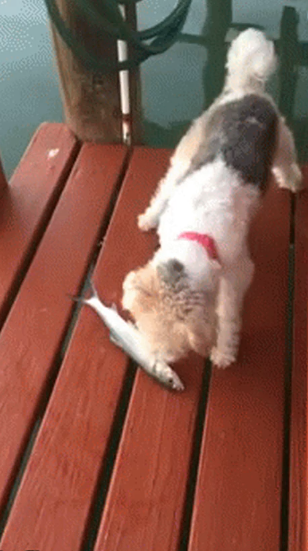 커뮤니티 사이트에 올라온 짧은 영상으로 부두가로 추정되는 곳에 얌전히 있는 생선에게 관심을 보이던 강아지가 파닥거림에 놀라 풍덩하는 모습은 보는 이에게 즐거움을 선사해주고 있습니다.