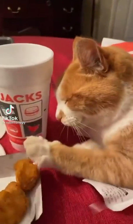 동영상 플랫폼 틱톡에 유저가 올린 16초 짜리 짧은 영상으로 테이블 위에서 너겟과 함께 식사를 하고 있는 중 고양이가 호시탐탐 노리고 얻기 위해서 계속 시도를 하고 있습니다.