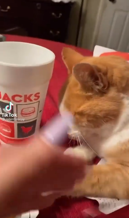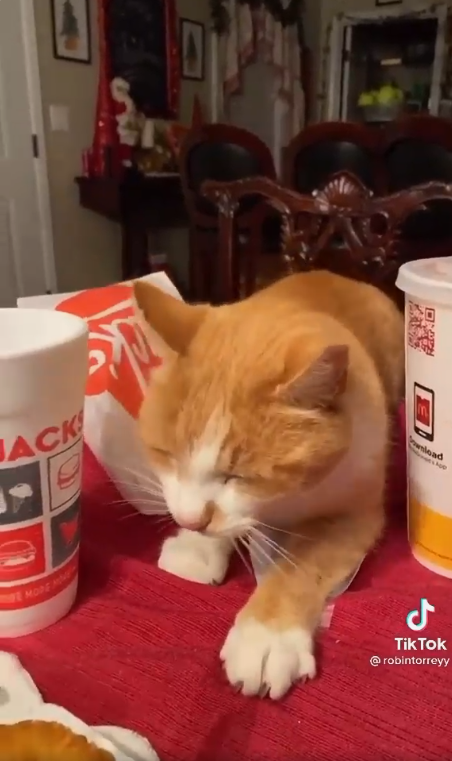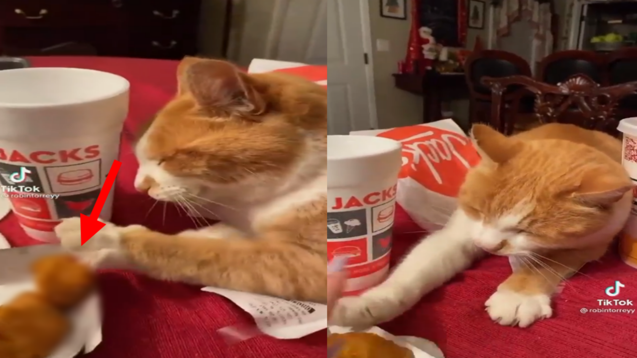 동영상 플랫폼 틱톡에 유저가 올린 16초 짜리 짧은 영상으로 테이블 위에서 너겟과 함께 식사를 하고 있는 중 고양이가 호시탐탐 노리고 얻기 위해서 계속 시도를 하고 있습니다.