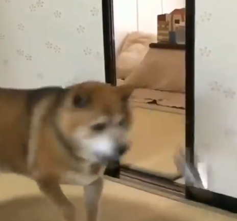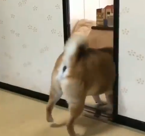 영상에서 강아지는 주인을 바라보고 짓는 것으로 시작을 합니다. 무언가 대화를 하고 있는 것처럼 보이는데 강아지는 주인과 소통이 잘 되지 않는다고 느꼈는지 고개를 돌리고 바로 옆에 있는 방에 들어가서 무언가를 가지고 나옵니다.