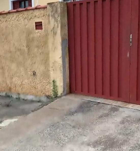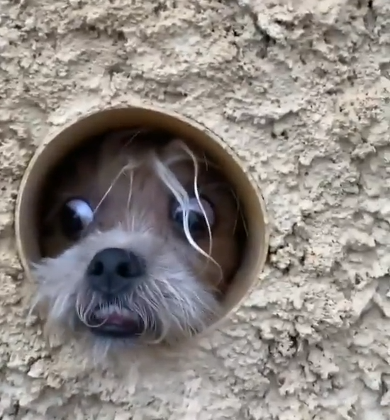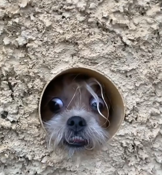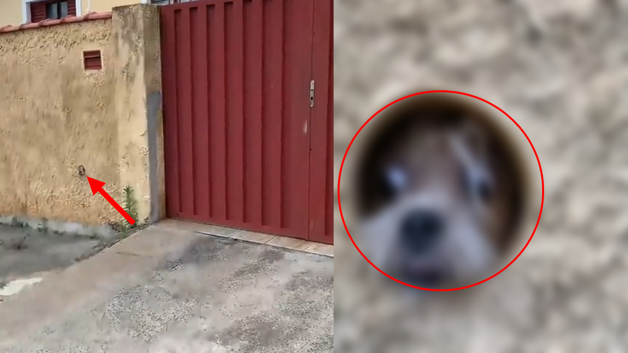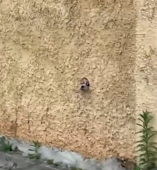 담장이 높은 붉은 대문의 집을 향해 들어가고 있던 집 주인은 벽에 설치가 된 배수 기능을 하고 있는 작은 구멍에서 무언가를 발견을 하였습니다. 그리고 카메라를 확대해보니 자신이 집에서 키우는 댕댕이가 고개를 내밀고 있었습니다.