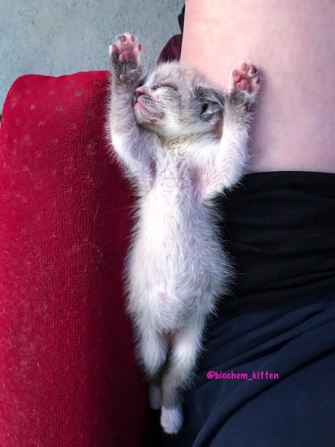 이 고양이를 포함한 총 3마리의 냥냥이는 생후 1주일이 되었을때 구조가 되었고, 너무 작고 어리기 때문에 마땅한 사람을 찾지 못하여 입양을 보내지 못하였다고 합니다.